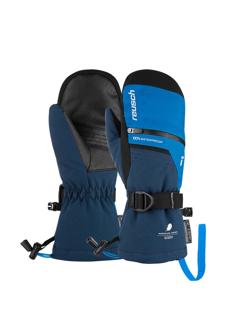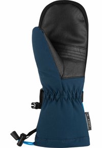 Moufles imperméables avec un extérieur en tissu bleu foncé et des paumes en cuir noir. Comprend des poignets ajustables et un accent bleu vif à l'arrière.