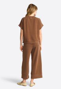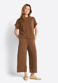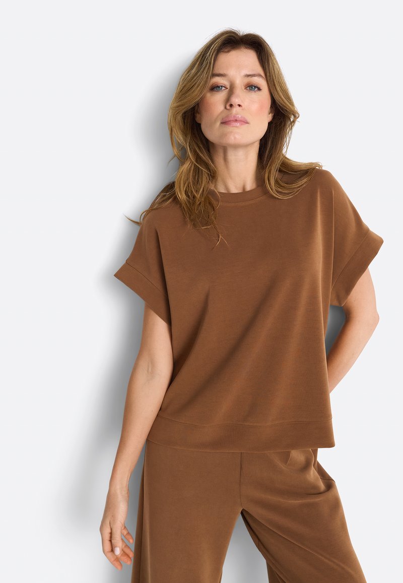 Femme aux cheveux châtain clair mi-longs portant un haut marron à manches courtes et un pantalon large assorti, debout devant un fond blanc.