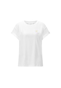 Femme aux longs cheveux foncés portant un t-shirt blanc à manches retroussées avec un motif marguerite et un jean bleu clair, debout devant un fond blanc.