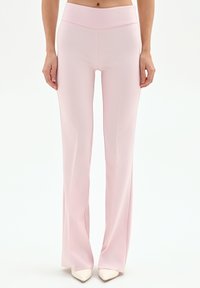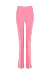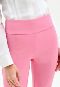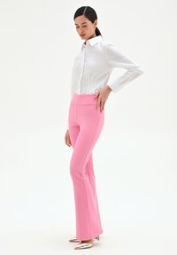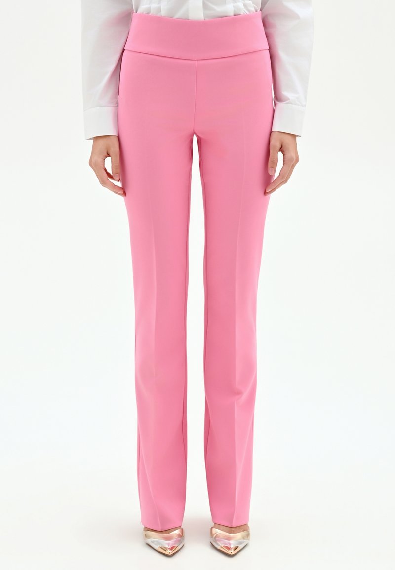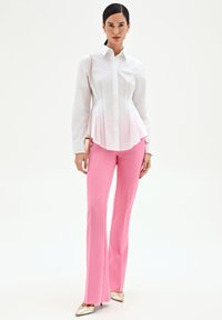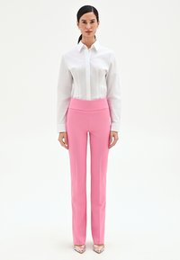 Pantalon rose droit à taille haute porté avec une chemise blanche à manches longues et des talons métalliques à bout pointu, debout face à l'avant.