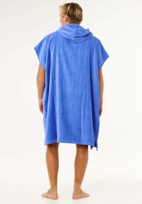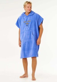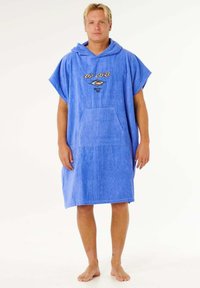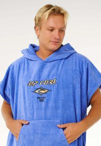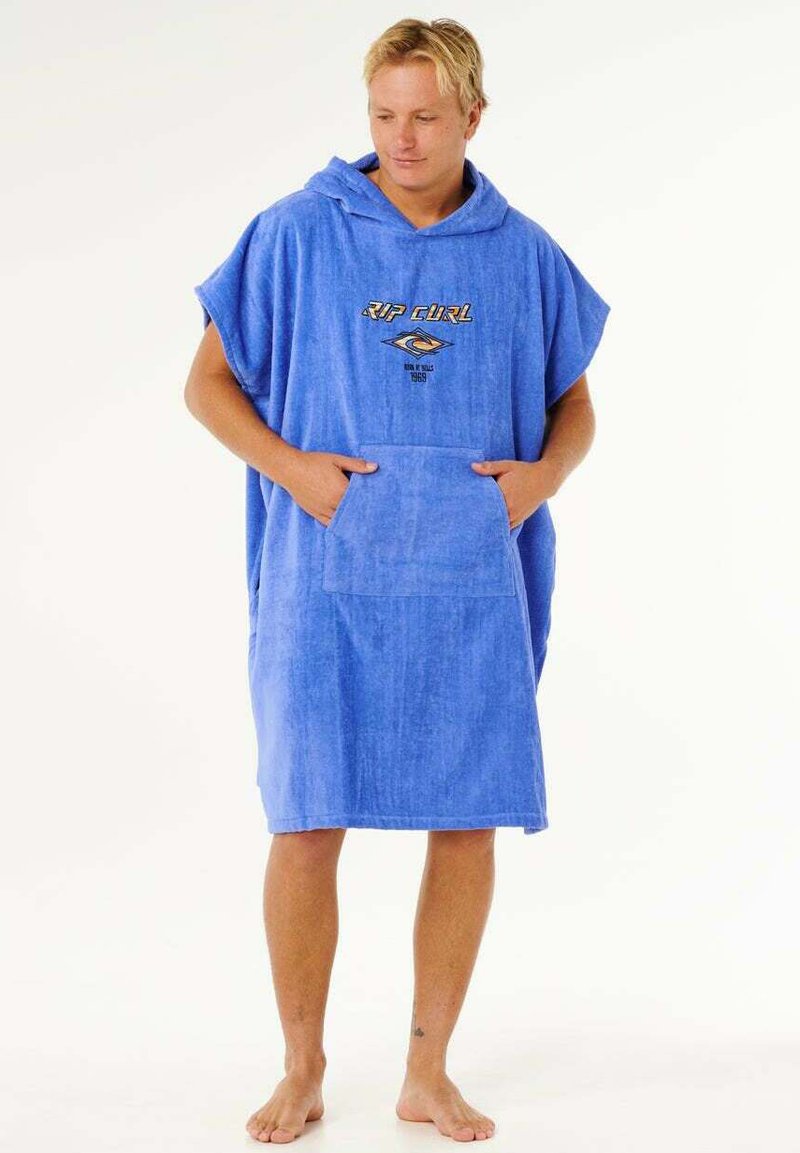 Jeune homme portant un poncho serviette à capuche bleu avec une grande poche avant et le logo "Rip Curl", debout pieds nus sur un fond blanc.