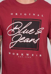 T-shirt en coton rouge avec un imprimé graphique comportant le texte "Blue & Jeans" et "Original Workwear" en blanc et noir, col rond, manches courtes.