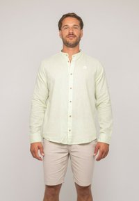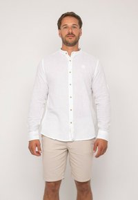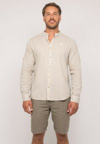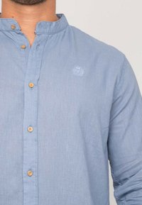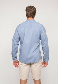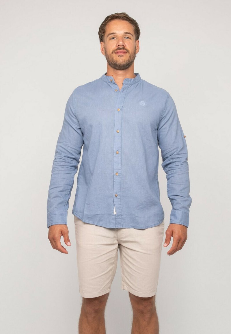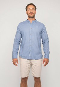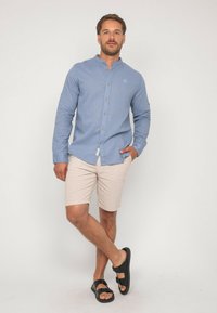 Homme portant une chemise à manches longues bleu clair à boutons avec col mandarin et un short beige, debout devant un fond clair uni.