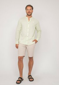 Homme debout, face à la caméra, portant une chemise à manches longues vert clair à boutons et un short beige, sur un fond uni.