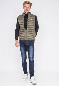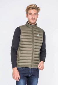 Doudoune sans manches vert olive avec un col haut et une fermeture éclair à l'avant, présentant des coutures horizontales et un logo circulaire sur la poitrine gauche. Chemise à manches longues noire en dessous.
