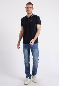 Homme portant un polo bleu marine avec des bordures jaunes et un jean bleu clair, debout devant un fond blanc uni.