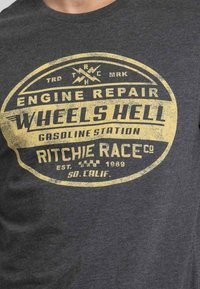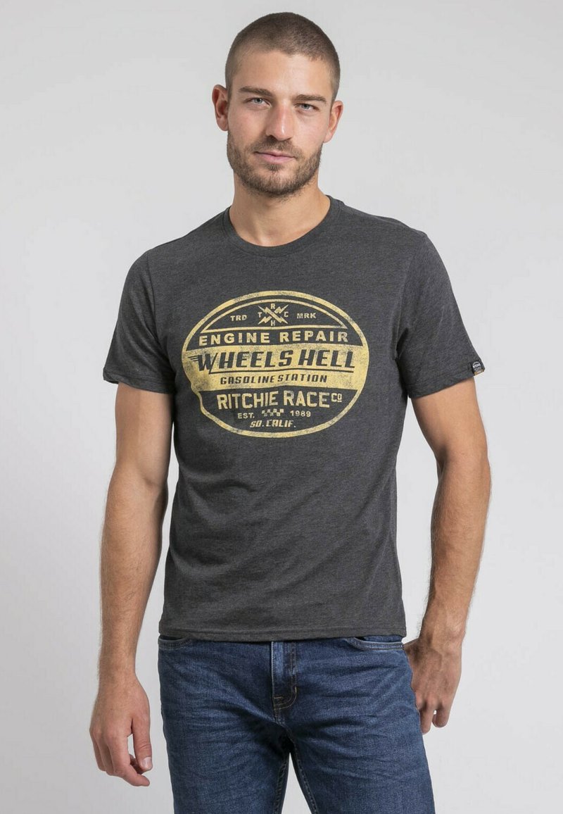 T-shirt gris à manches courtes avec un graphique circulaire doré contenant le texte "REPARATION DE MOTEUR ROUES ENFER" et "RITCHIE RACE CO. FONDÉE EN 1989."