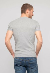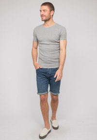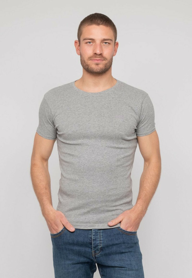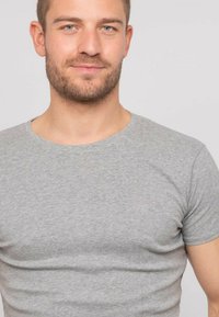 T-shirt gris à manches courtes avec un col rond, fabriqué dans un tissu doux, avec une silhouette ajustée et sans motifs ni logos visibles.