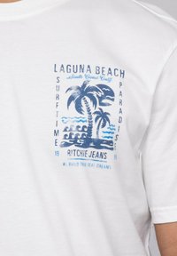Homme portant un t-shirt blanc avec un motif de palmier bleu et une vague, comportant un texte sur Laguna Beach, le surf et Treasure Island.