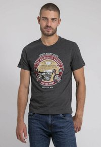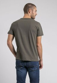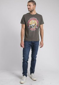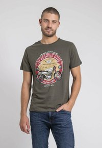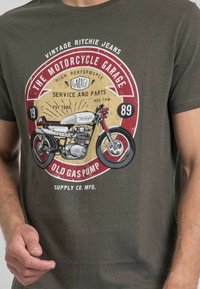 T-shirt en coton vert olive avec un motif de moto vintage en rouge et beige, manches courtes et encolure ronde.