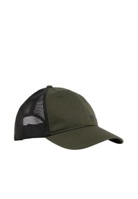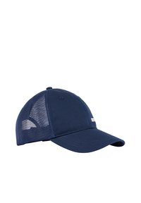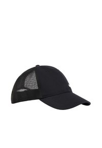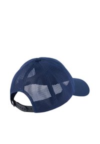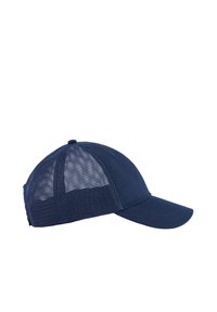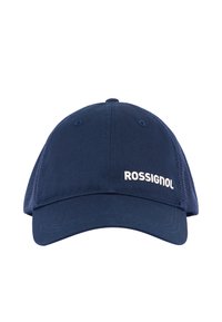 Femme portant une casquette Rossignol bleu marine à dos en filet, de petites boucles d'oreilles créoles, et un t-shirt blanc à col rond, regardant légèrement sur le côté.