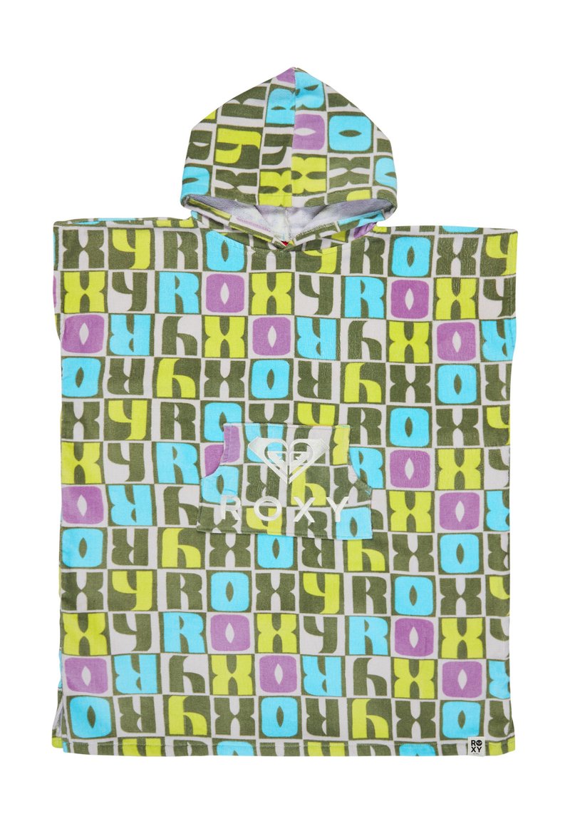 Poncho de plage à capuche coloré avec un motif en blocs multicolores "ROXY" et une poche avant avec le logo ROXY sur fond blanc.
