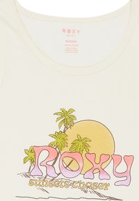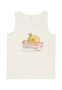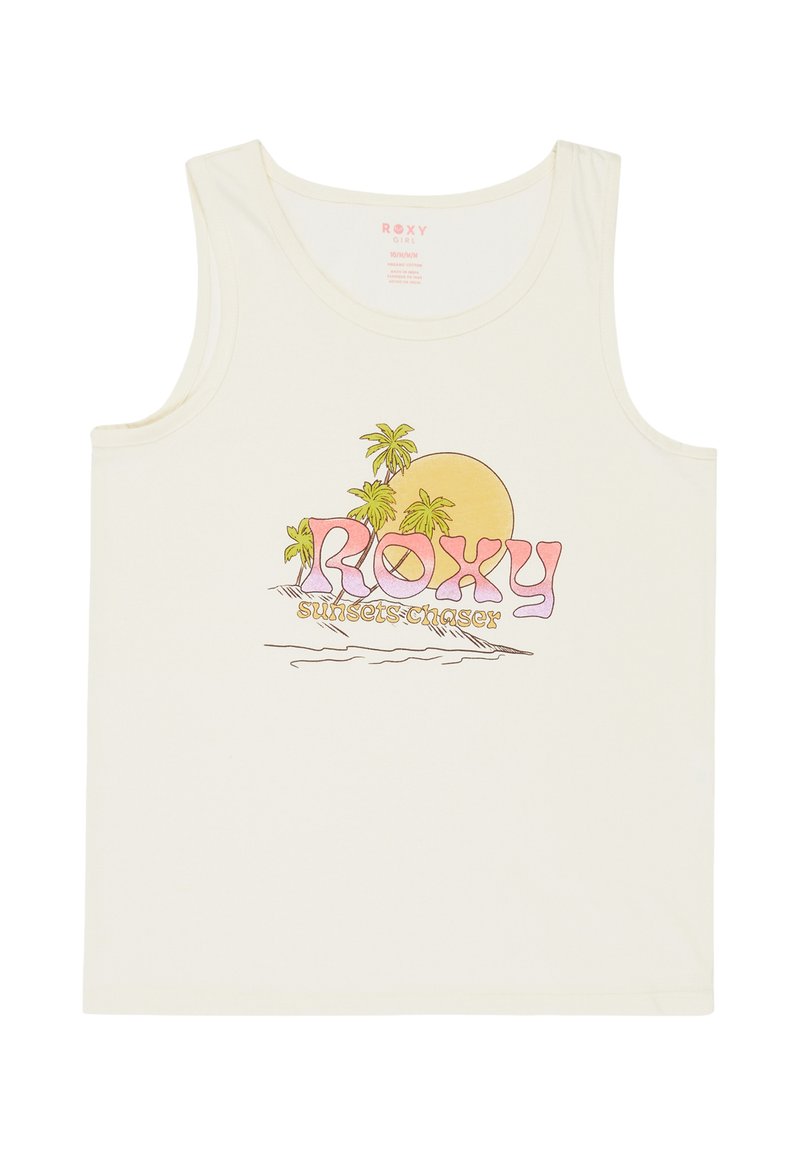 Haut sans manches blanc avec un logo "ROXY" pastel, des palmiers, un soleil jaune et le texte "sunsets chaser" dans un design à thème plage.