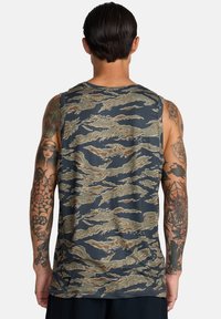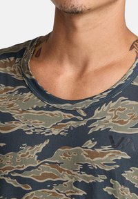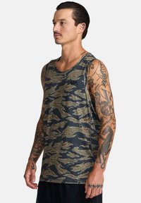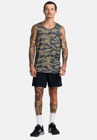 Homme aux cheveux lissés en arrière et tatouages sur les bras, portant un débardeur camouflage sans manches et un short noir, sur un fond uni.