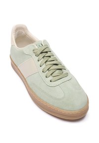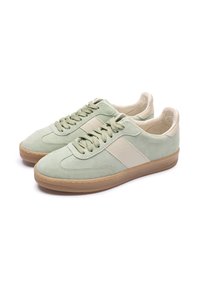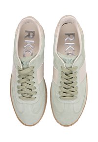 Personne portant des baskets en daim vert clair et un jean bleu clair, assise les bras reposant sur les genoux, montrant une bague en or à la main gauche.