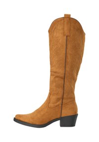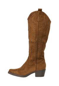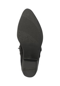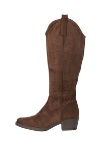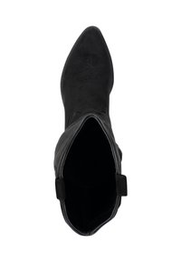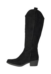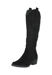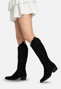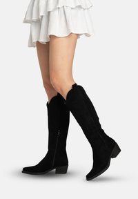 Jambes portant une jupe courte blanche à volants et des bottes mi-hautes en daim noir avec des talons blocs bas, debout devant un fond uni.