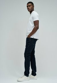 Homme portant un t-shirt blanc uni à manches courtes et un jean foncé, debout devant un fond gris clair uni avec une main dans la poche.