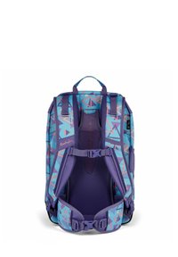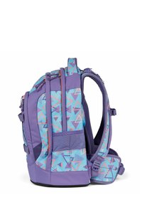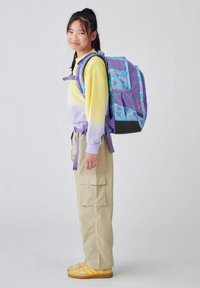 Jeune personne portant un pantalon cargo beige, des baskets jaunes, un sweat-shirt pastel violet et jaune, portant un grand sac à dos bleu et violet à motifs.