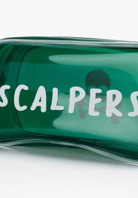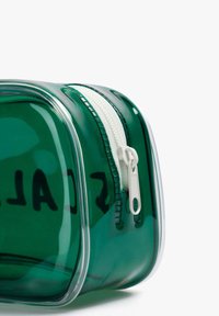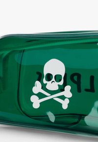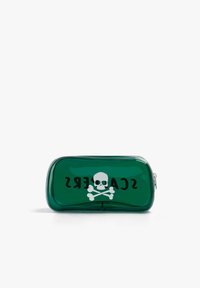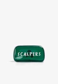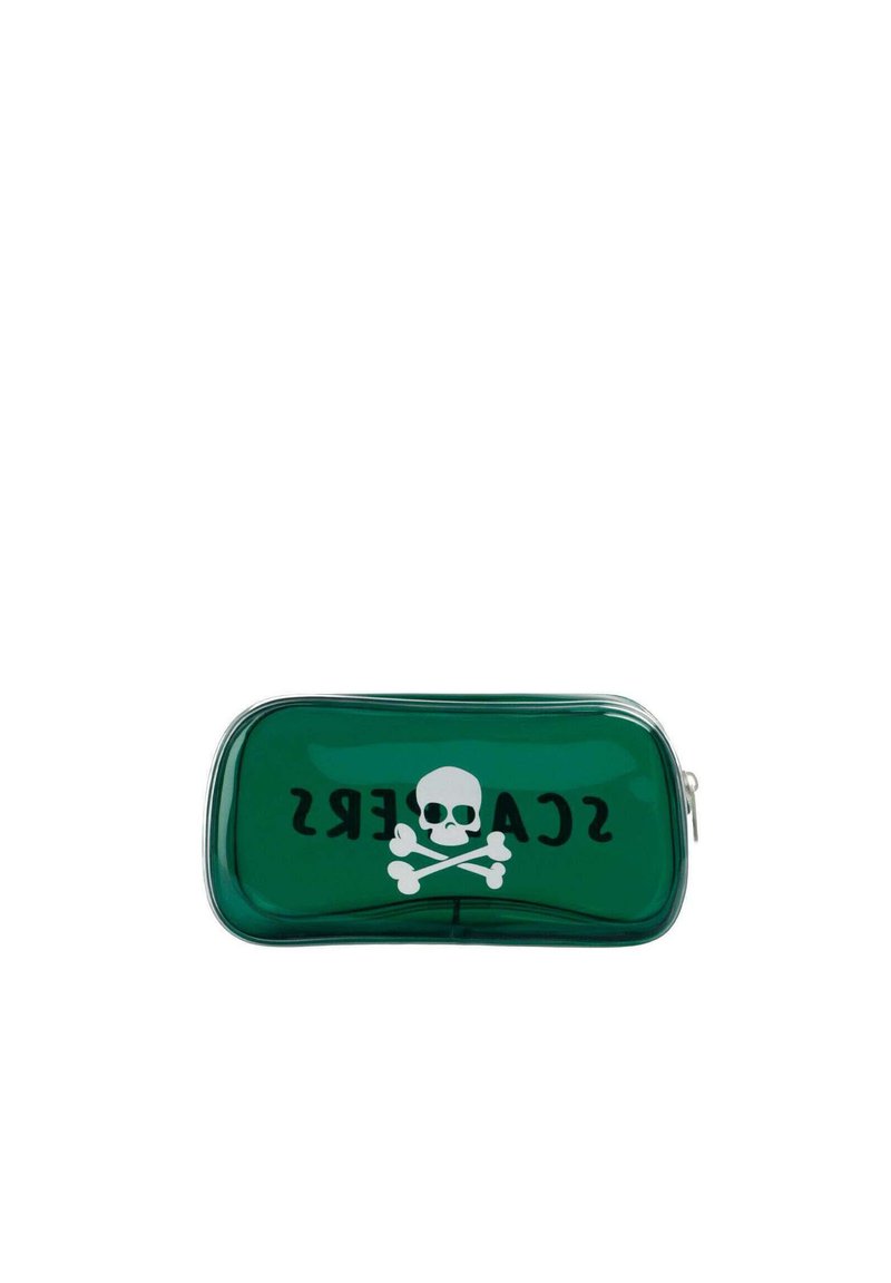 Pochette rectangulaire transparente verte avec un crâne et des os croisés blancs et le texte "SCACERS" en noir, inversé, sur le devant.