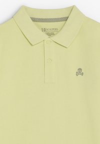 Polo à manches courtes vert clair avec col, patte de boutonnage à deux boutons, et petit logo gris de tete de mort et os croisés sur la poitrine gauche.