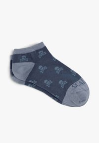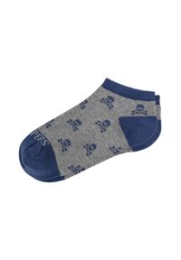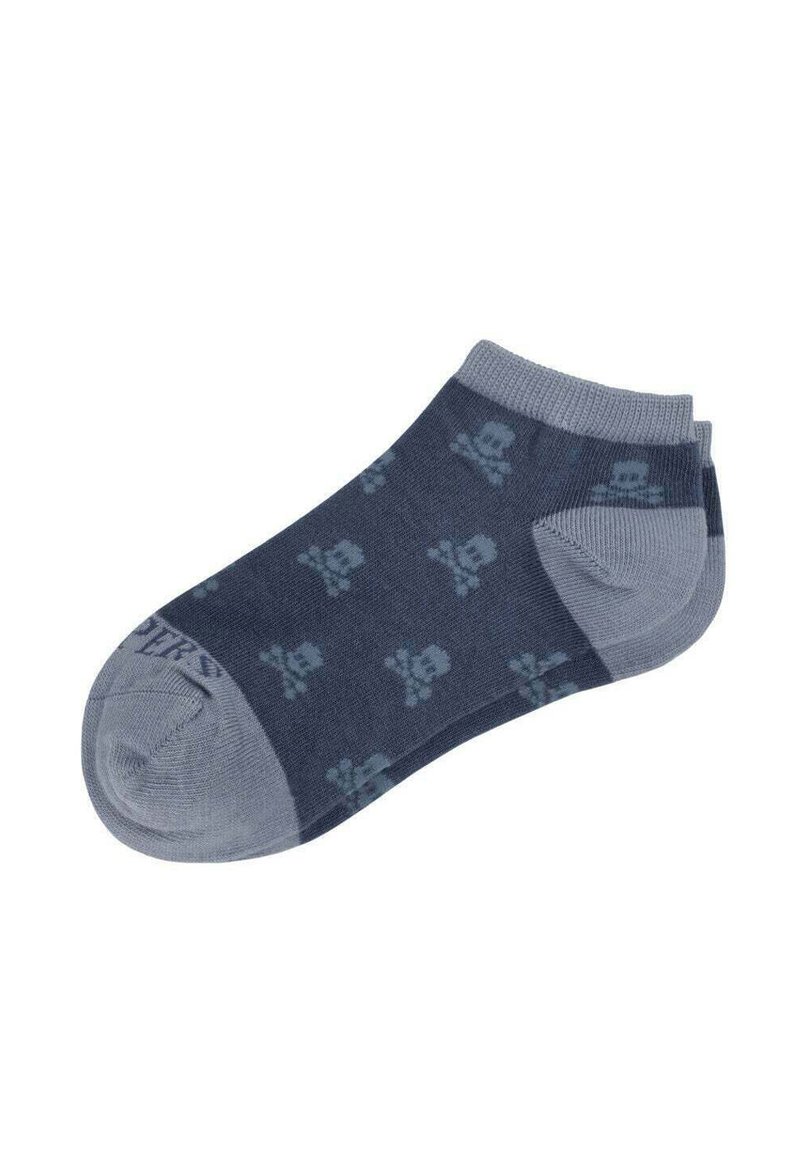 Chaussette gris foncé arrivant à la cheville avec talon, orteil et bordure gris plus clair, ornée d'un motif répété de crânes et os croisés.