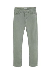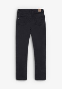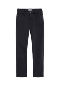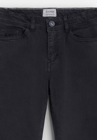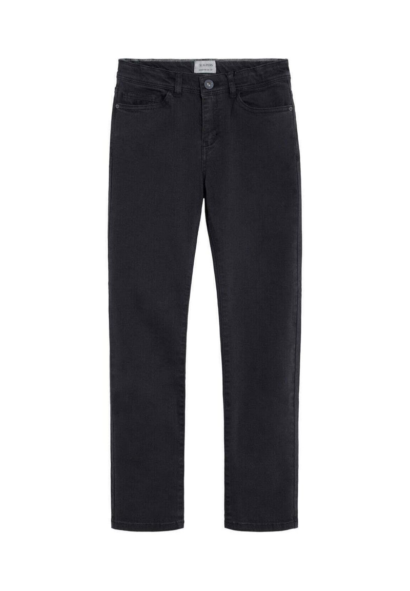 Jean noir slim avec cinq poches, fermeture à boutons et passants pour ceinture, présenté à plat sur un fond blanc.