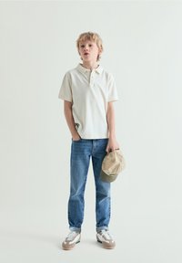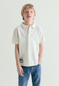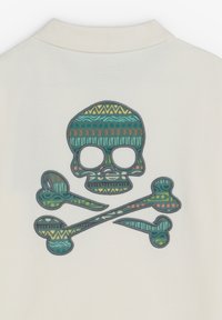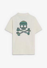 Enfant aux cheveux blonds vu de dos, portant un polo blanc avec un crâne vert à motif et des os croisés dans le dos, assorti à un jean bleu.
