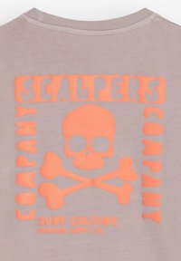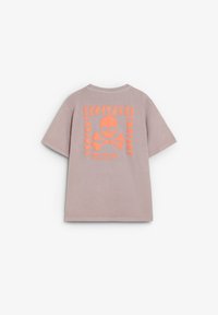 T-shirt beige à manches courtes et col rond avec petit logo orange sur le côté gauche de la poitrine, présenté sur un fond blanc.