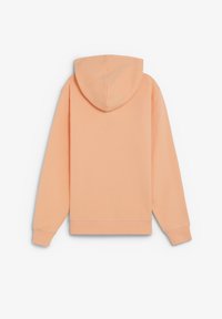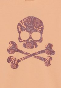 Sweat à capuche couleur pêche avec un design de tête de mort et os croisés violets ornés de motifs floraux sur le devant, présenté sur un fond blanc.