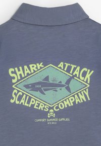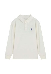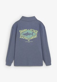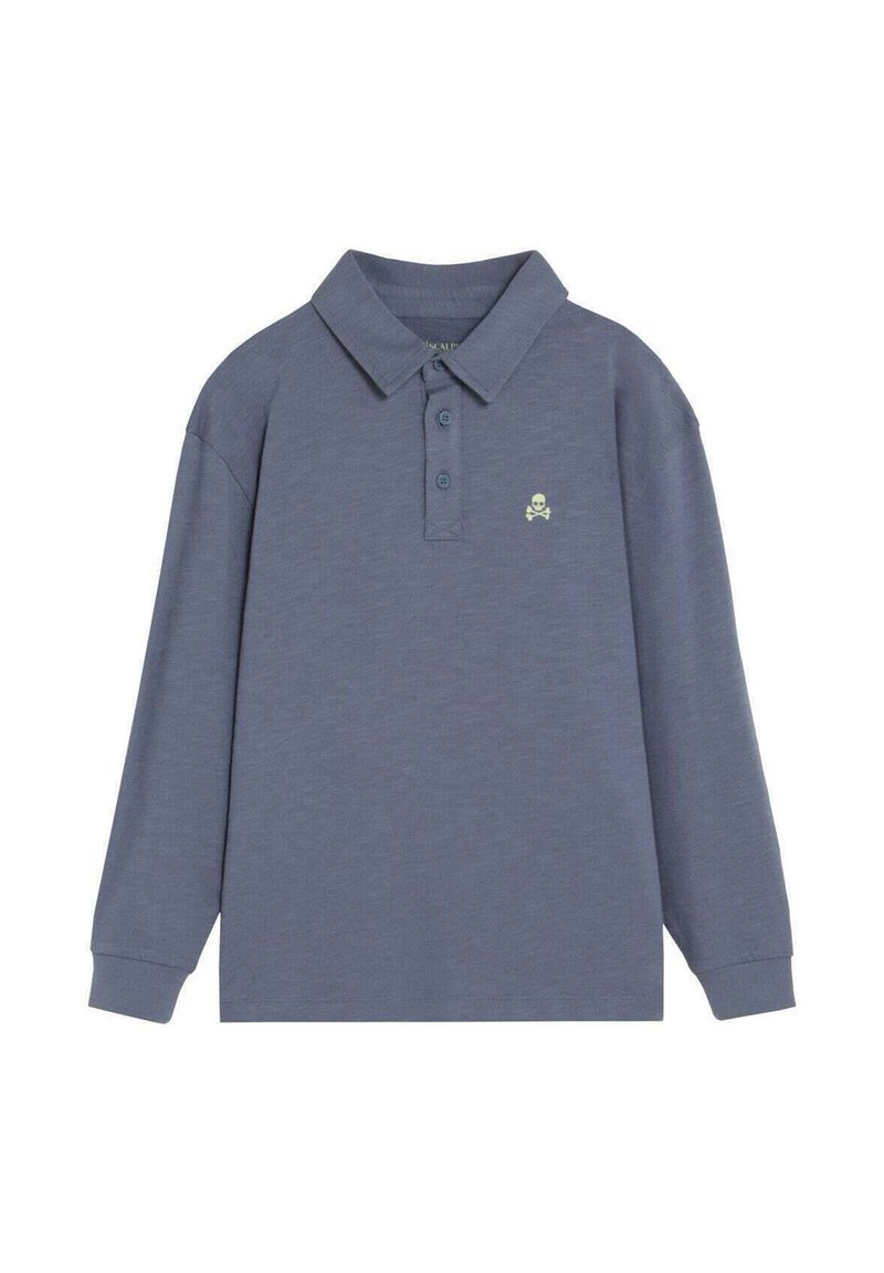 Polo bleu à manches longues avec trois boutons et un petit logo tête de mort et os croisés sur le côté gauche de la poitrine.