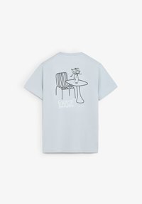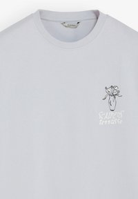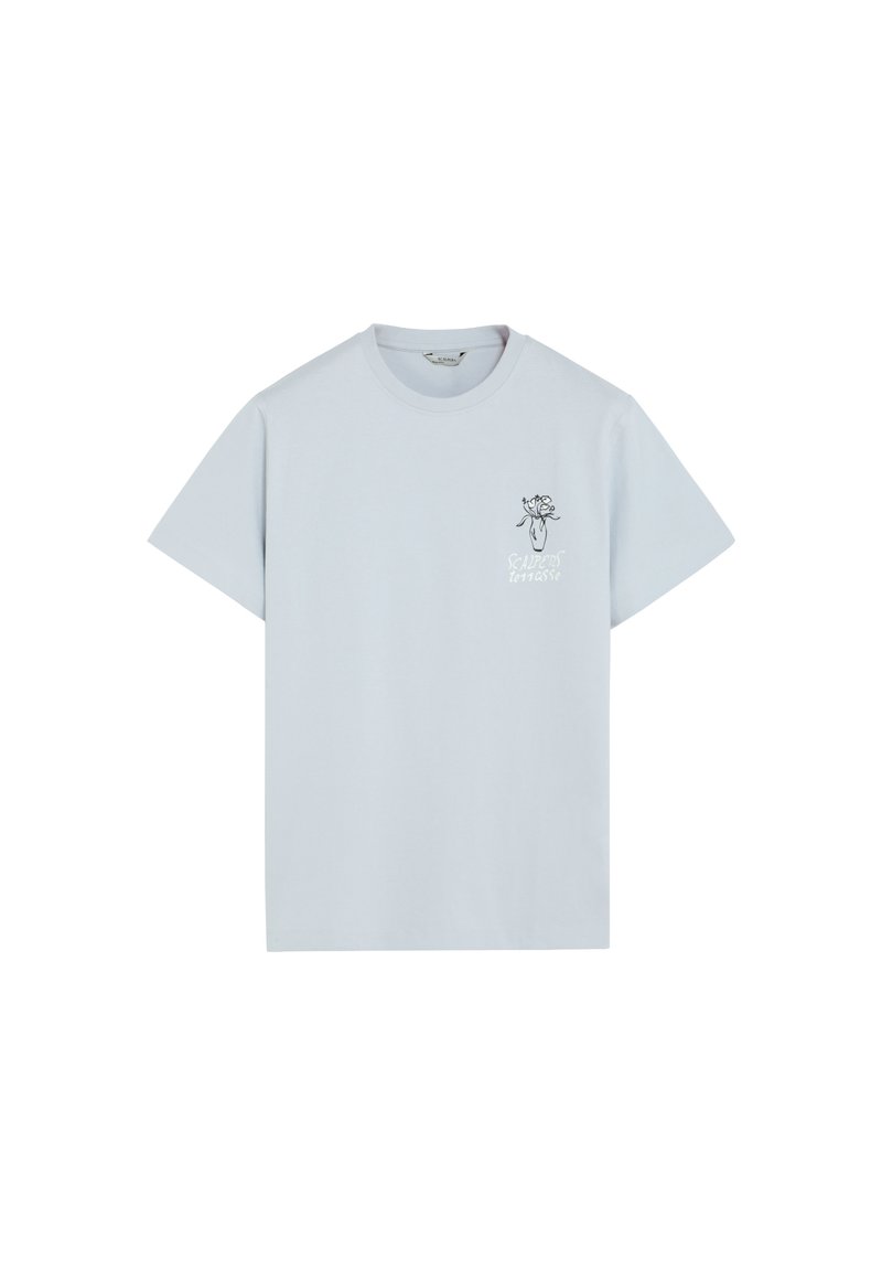 T-shirt bleu clair à manches courtes avec un col rond, petit dessin en ligne noir de fleurs dans un vase et texte blanc sur le côté gauche de la poitrine.