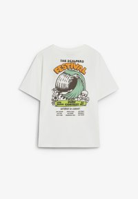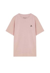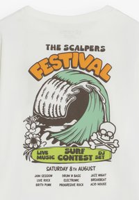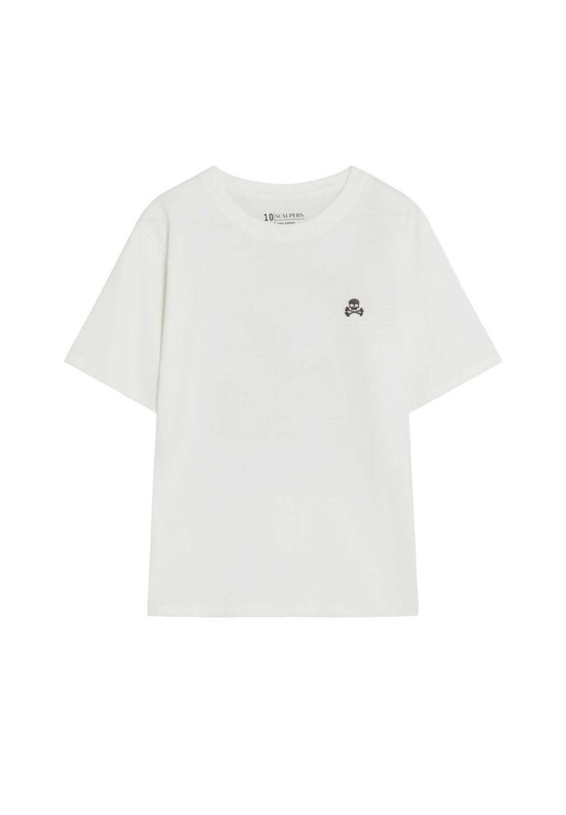 T-shirt blanc à manches courtes avec petit logo crâne et os croisés noirs sur la poitrine gauche, col rond et coupe décontractée.