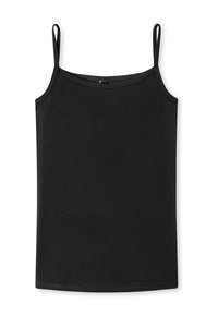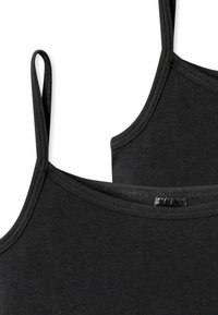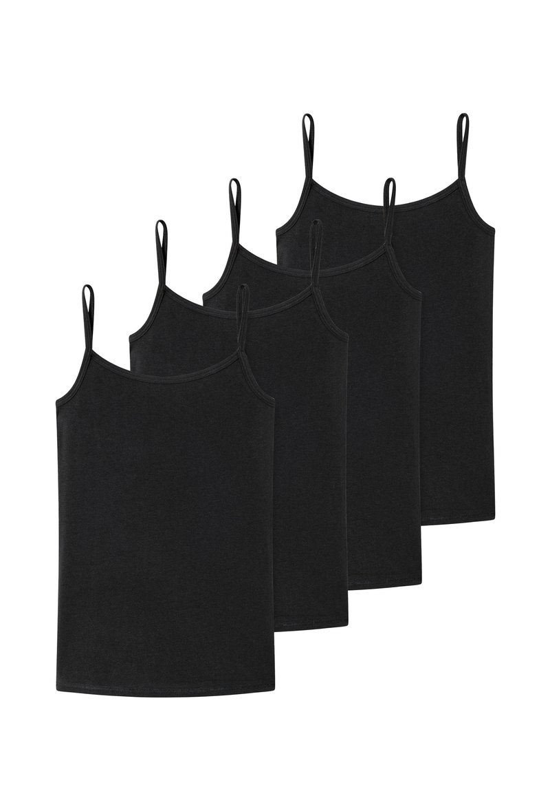 Cinq camisoles noires sans manches avec fines bretelles disposées en chevauchement sur un fond blanc.