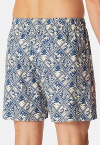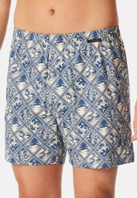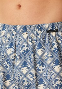 Maillots de bain pour homme présentant un motif de losanges bleu et blanc, fabriqués à partir d'un tissu léger avec une ceinture élastique et une doublure intégrée.