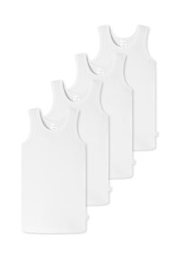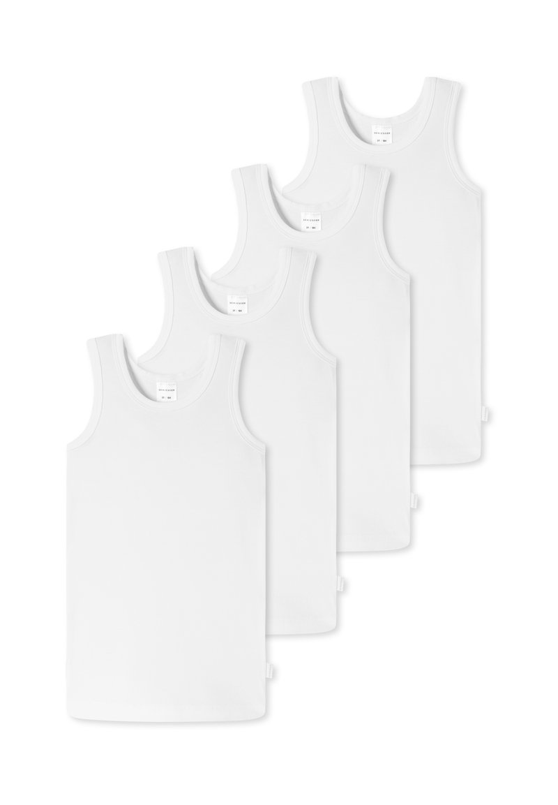 Quatre débardeurs blancs unis sans manches disposés en diagonale, chaque débardeur chevauchant légèrement le suivant, présentés sur un fond blanc.