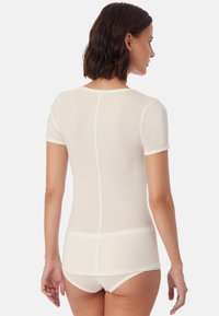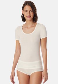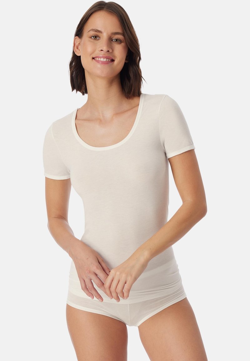 Femme souriante portant un t-shirt blanc moulant à manches courtes et col rond, ainsi qu'un slip blanc assorti, debout devant un fond uni.