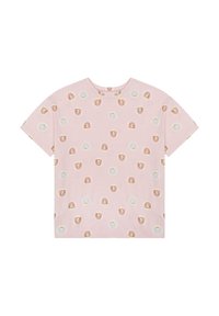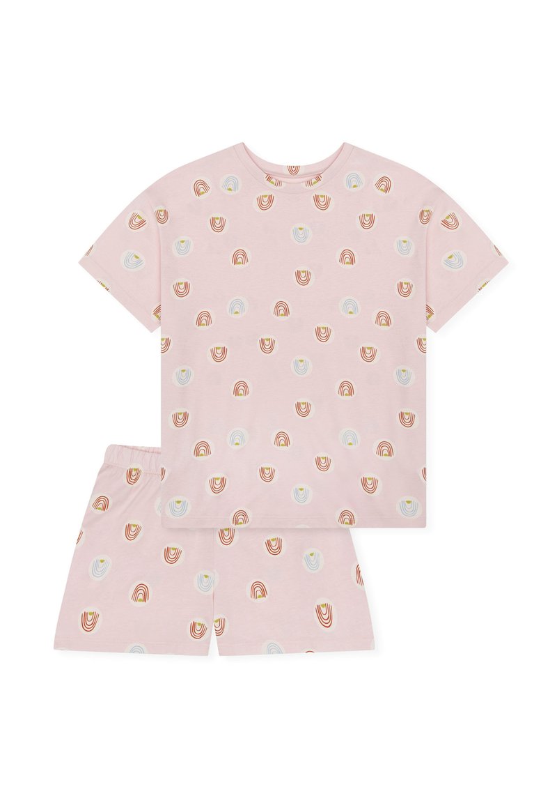 Ensemble chemise à manches courtes et short rose pâle avec un motif de petites formes abstraites multicolores en forme d'arc-en-ciel, espacées uniformément.