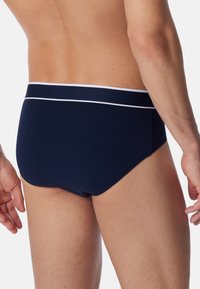 Caleçons pour hommes bleu marine avec une ceinture élastique blanche portant le logo "SCHIESSER". Tissu lisse, coupe ajustée et détails de coutures minimaux.