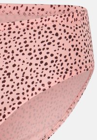 Cinq sous-vêtements hipster pour femmes à pois noirs et deux roses, disposés en pile décalée.