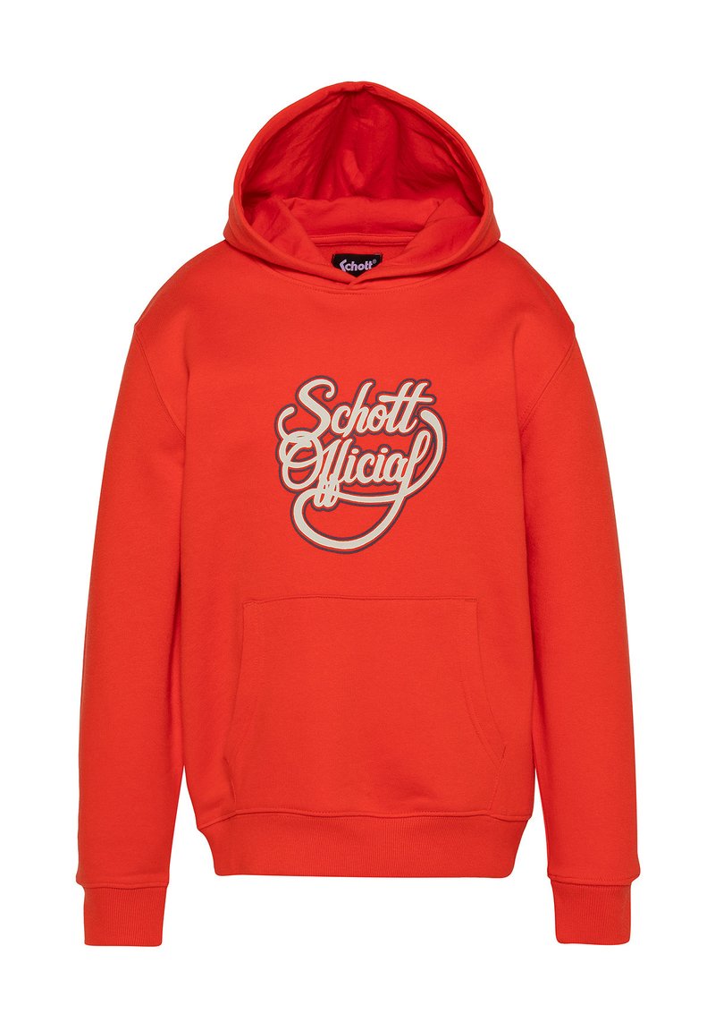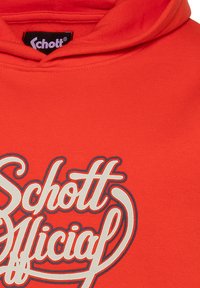 Sweat à capuche rouge vif avec poche kangourou à l'avant et texte blanc stylisé "Schott Official" centré sur la poitrine.