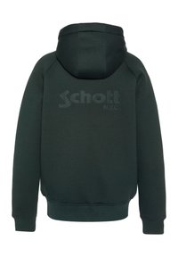 Hoodie à fermeture éclair vert foncé avec poches avant, cordons noirs, doublure intérieure grise et petit logo blanc "Schott" sur le côté gauche de la poitrine.