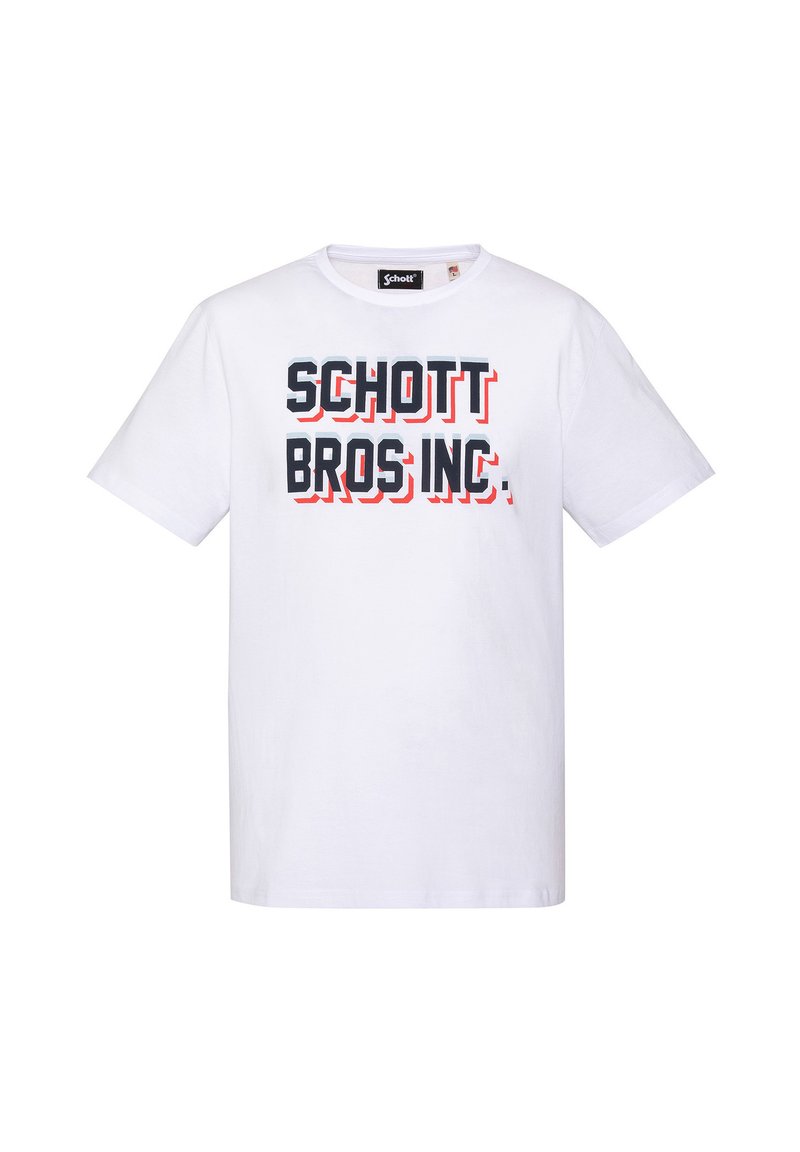 T-shirt blanc à manches courtes avec un texte en relief 3D noir et rouge disant "SCHOTT BROS INC." sur le devant.