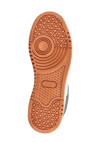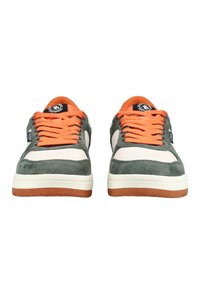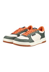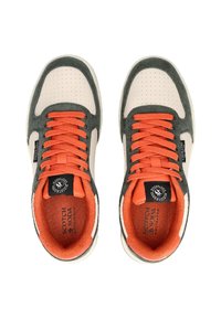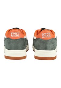 Baskets basses avec panneaux en daim vert, sections en cuir blanc, lacets orange et col rembourré orange, de la marque "Scotch & Soda Amsterdam".