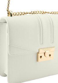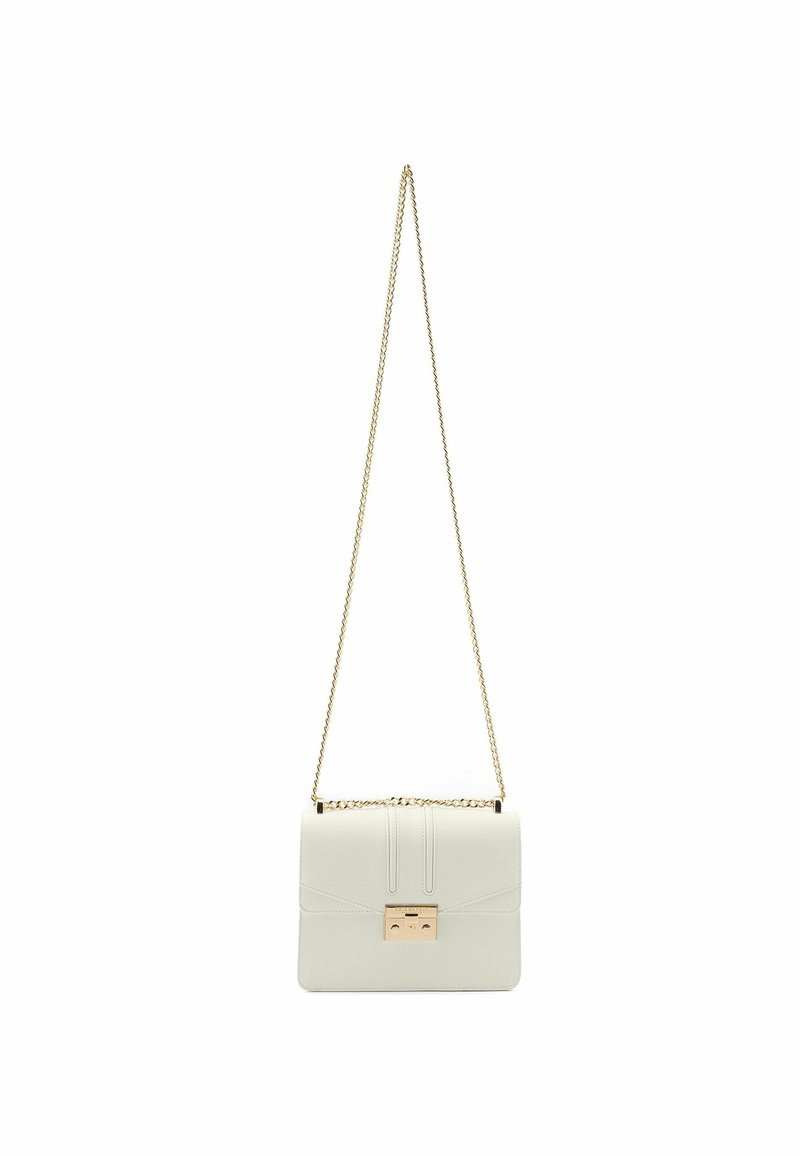 Petit sac à bandoulière en cuir blanc avec une lanière chaîne dorée et un fermoir rectangulaire doré sur le rabat avant.