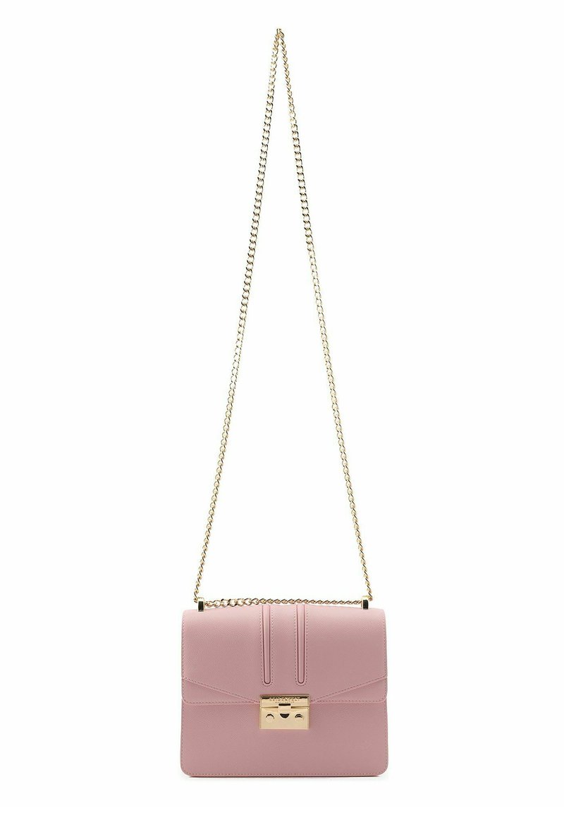 Sac à bandoulière rectangulaire en cuir rose clair avec une chaîne dorée comme bandoulière et une fermeture à boucle dorée sur le rabat frontal.