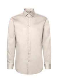 Chemise blanche à boutons, en coton lisse ; dotée de manches longues et d'un col classique. Associée à un pantalon foncé plissé.