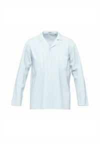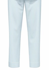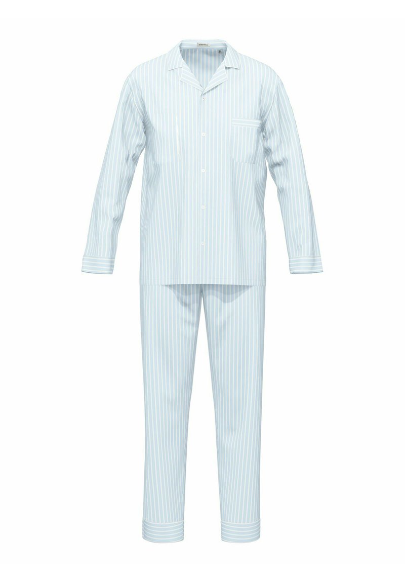 Ensemble de pyjama rayé bleu clair en tissu doux ; comprend des manches longues, une poche poitrine et un pantalon droit avec des ourlets à revers.