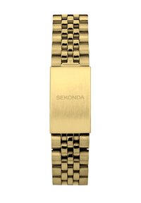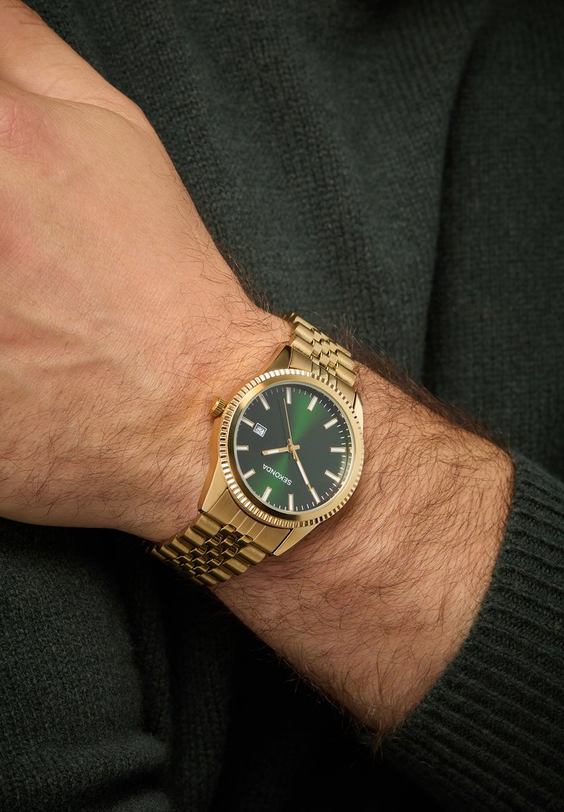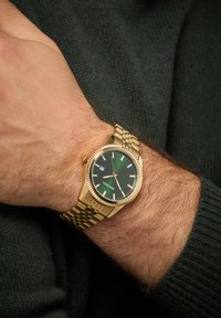 Montre en or avec un cadran vert, bracelet en maille métallique et index surélevés. Affiche la date et dispose d'une lunette texturée pour plus de détails.