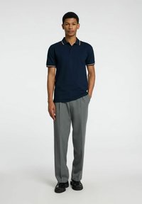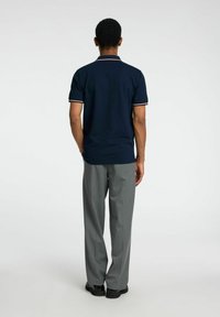 Polo shirt navy avec un col et des bordures de manches contrastants, fabriqué dans un tissu lisse. Associé à un pantalon plissé gris clair.