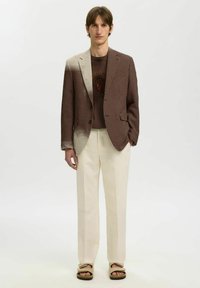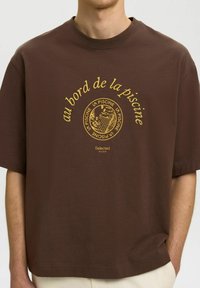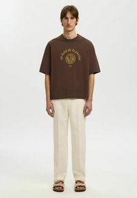 Jeune homme portant un t-shirt marron oversize avec le texte français jaune "au bord de la piscine" et un graphisme, associé à un pantalon beige clair.